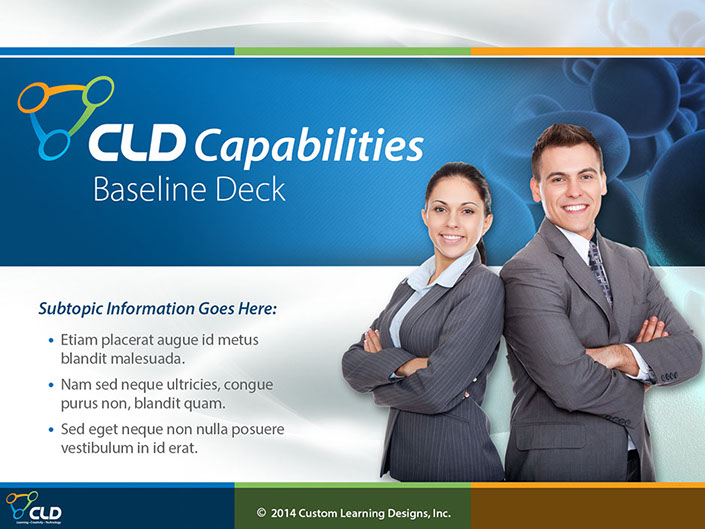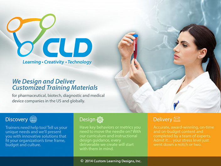 Contracted to do a redesign/update of Custom Learning Designs corporate materials. These materials were used for marketing presentations regularly put in front of pharmaceutical industry giants by the CLD sales and marketing team. Working with CLD's creative director I was able to meet there goals of creating a fresh new style, while keeping intact the CLD identity.