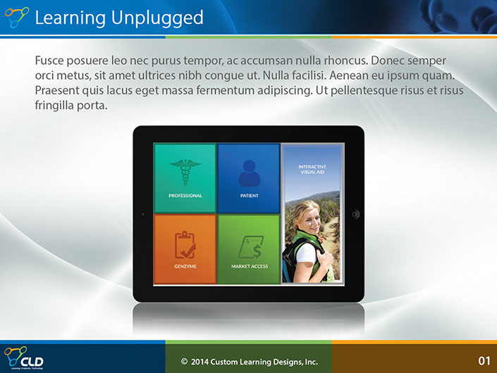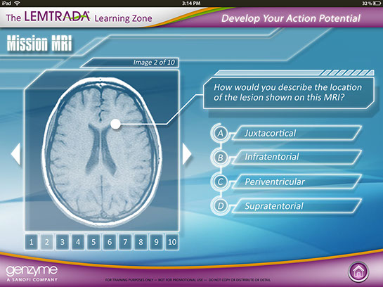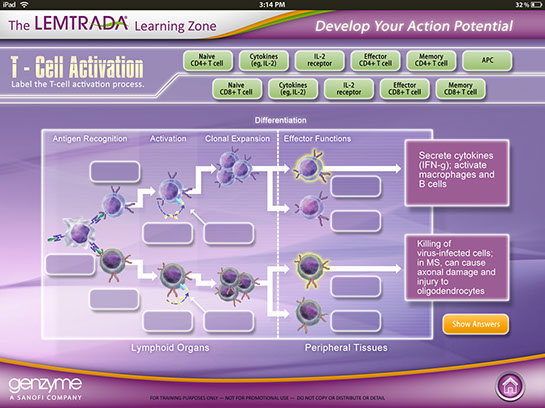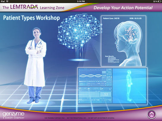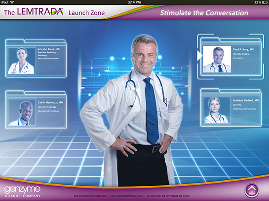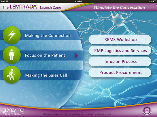 This was interactive multimedia tablet application to introduction sales reps for Sanofi Genzyme to educate them on the drug Lemtrada so that they could engage in meaningful conversations with Doctors and answer any questions they may have when considering prescribing Lemtrada to patients. I was brought on as a contractor by Custom Learning Designs (CLD) to great the look and feel and produce layouts for how the interactive elements would look, a long with how the green screen videos would look.