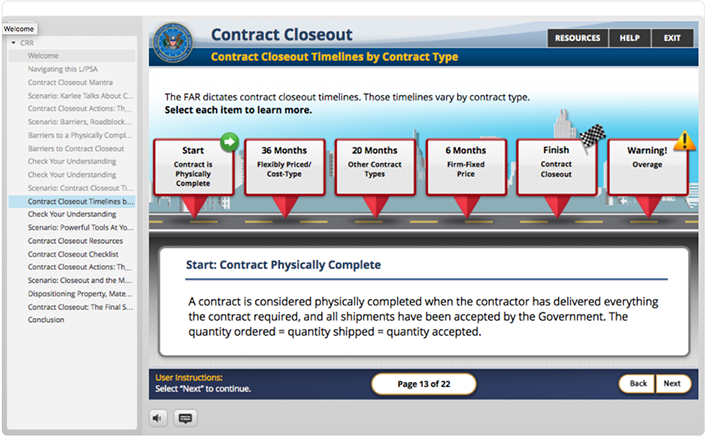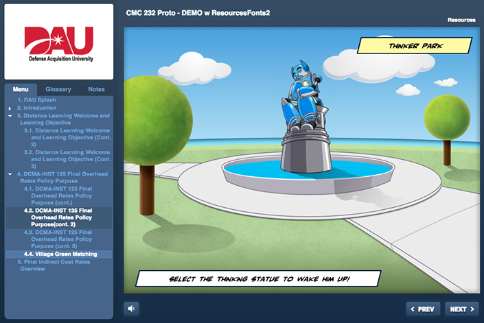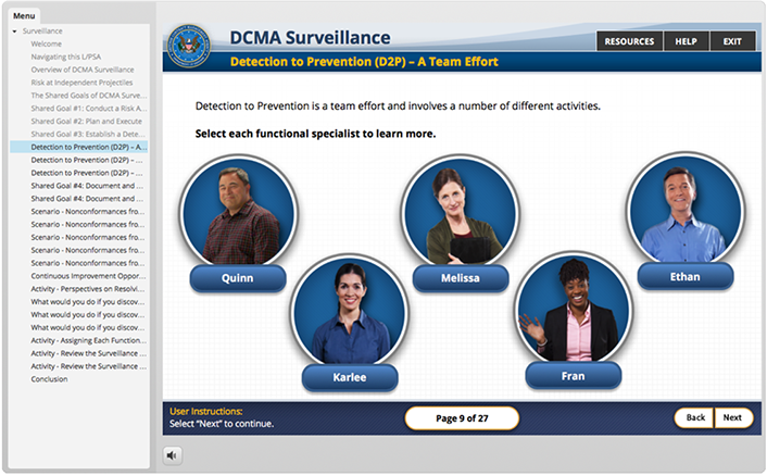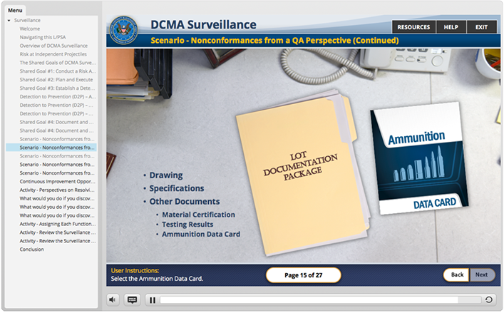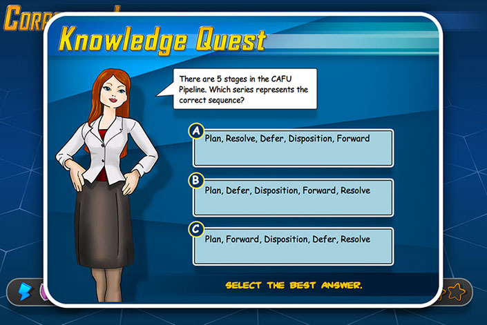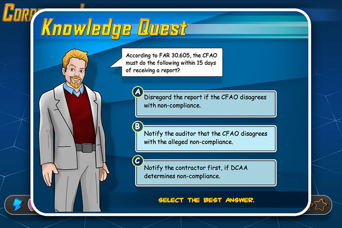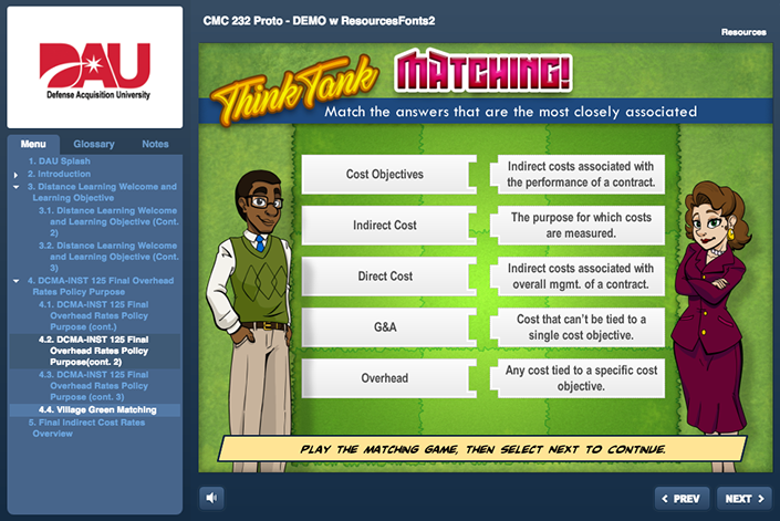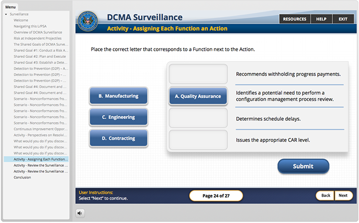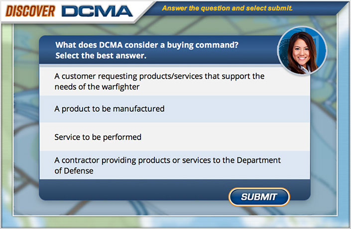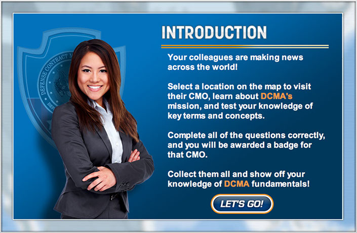 DCMA as part of a course that is being created to introduce new employees to the array of services and capabilities the DCMA offers the federal government. They wanted a game created that taught key terms regularly used in the field. It was decided that the content needed to be introduced in an engaging and entertaining way for maximum retention. "Gamification" always provides a great opportunity to break of the monotony of general of standard e-Learning.