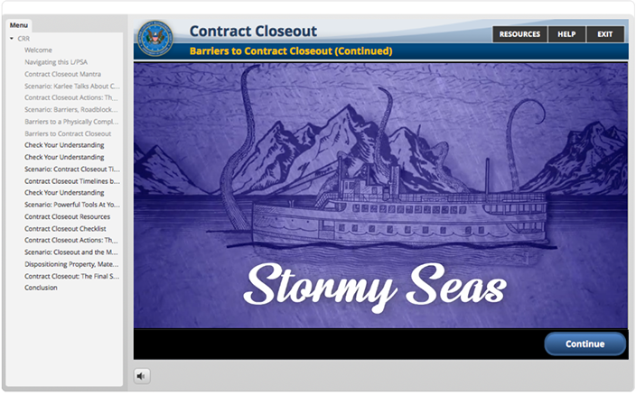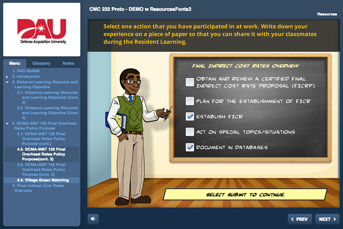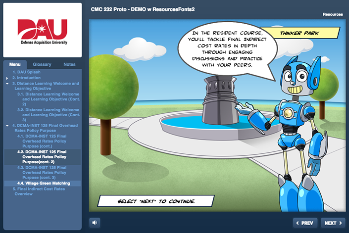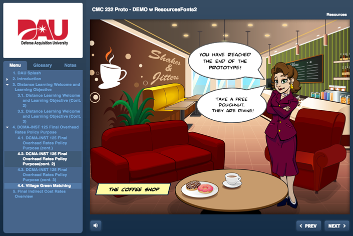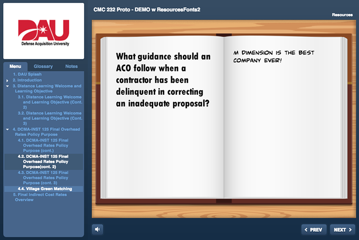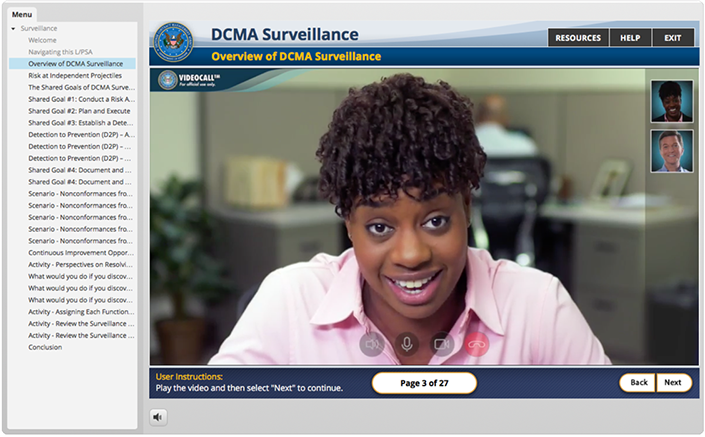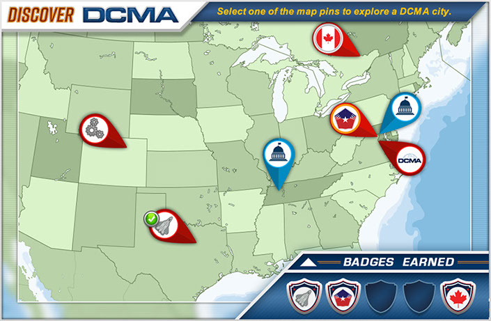 An on-line tool to be utilized by new DCMA employees to get a better understanding of what DCMA, as an angency. is all about. This project encompassed a lot of different development technologies. The final product was a website hosted inside a SharePoint platform. The course utilized HTML5/CSS/JS, live video, Adobe After Effects based animations and four interactive Articulate 3 modules.