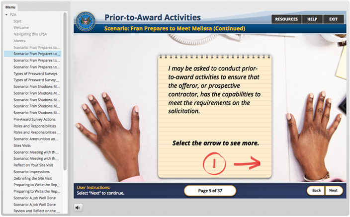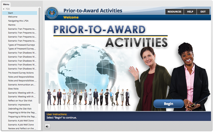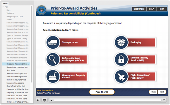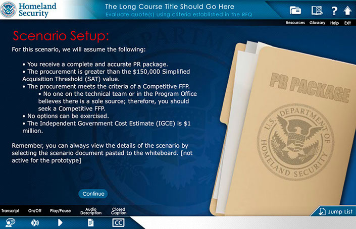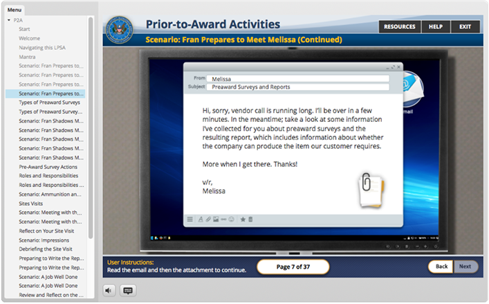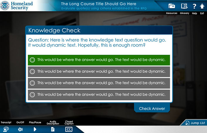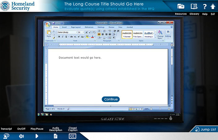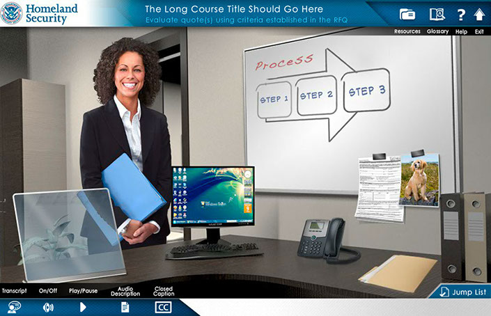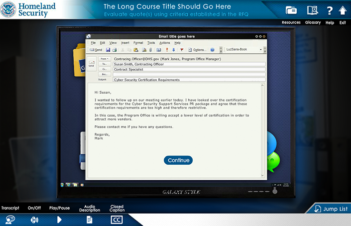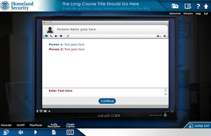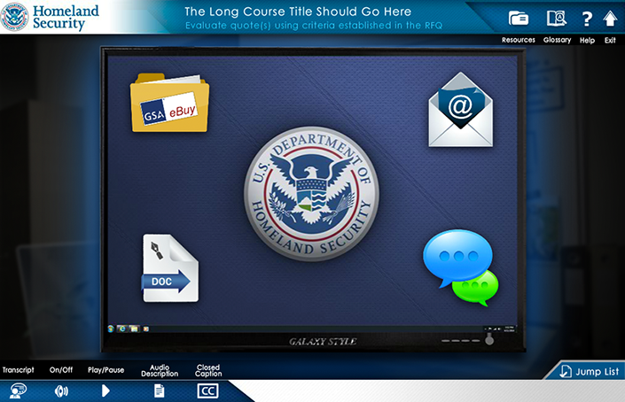 responsible for the creation of the look, feel and execution of DHS Buys, I created a design that utilized multiple interactive elements with integrated seamless green screen video characters. the user was presented with an office scenario where they had to interact with multiple office personnel to get direction to understand their given task and complete it. Intermittent reminders and helpful information would occur as the user progressed via a simulated "chat" conversation, e-mail, and accessing MS Word docs. Knowledge checks were utilized through out the course to test the users understanding of the material they were presented.