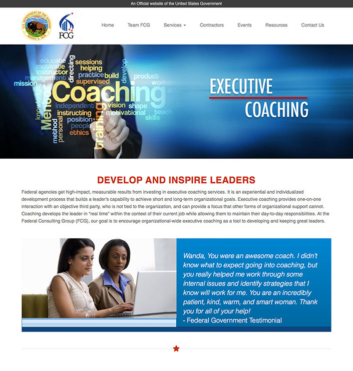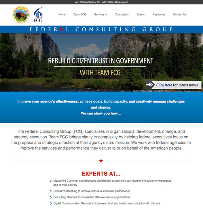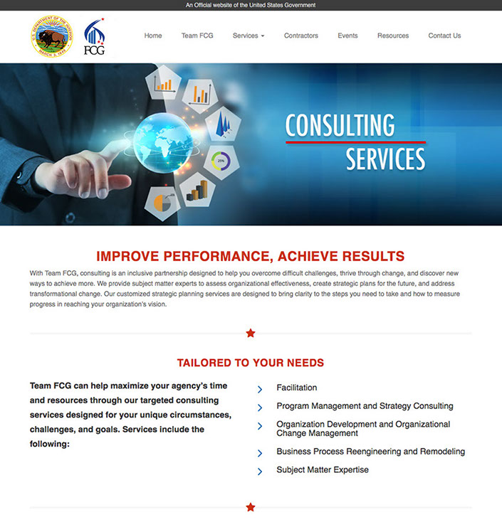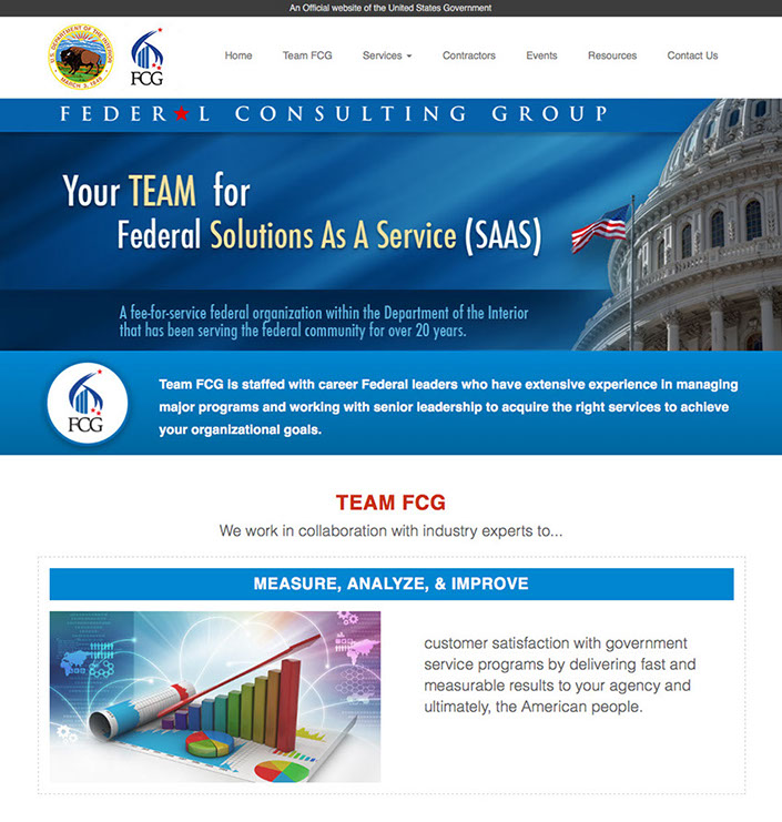 As the Creative Director for Cybermedia Technologies I was part of the team that went out captured this contract for a website redesign, along with behind the scenes Salesforce integration. FCG is essential a consulting agency in the U.S. government within the Department of Interior. The outwards facing portion of the contract was to create a more sophisticated professional look and feel for FCG, similar to private consulting firms. I created the new professional looking website in Drupal (DOI's CMS of choice). FCG wanted something created in an LMS to allow them to facilitate their own updates and maintenance once the website was handed off.