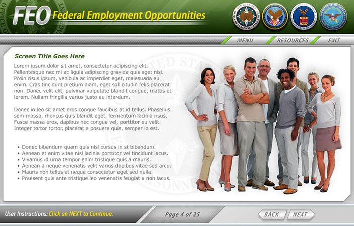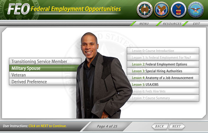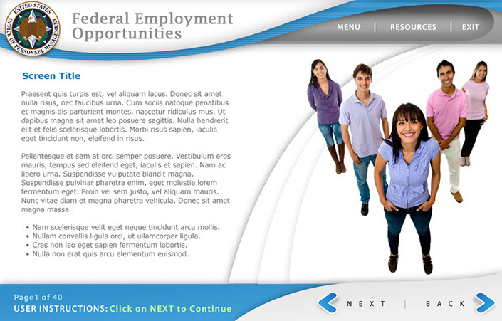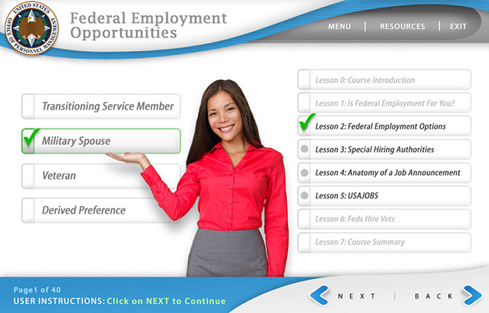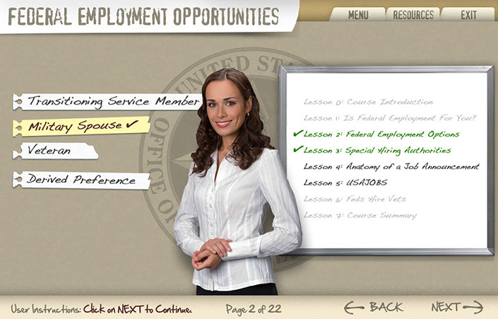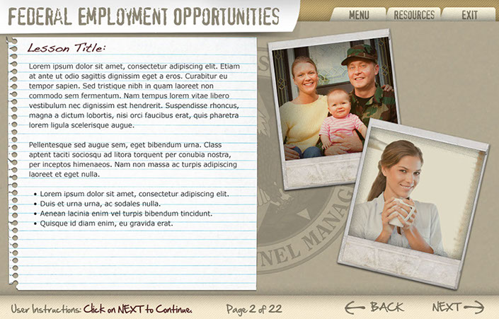 Three example interfaces created for the client to choose from for OPM's Federal Employment Opportunities. This course was to help train FEO employees how to help former military and military spouses employment opportunities within the Federal Government. Ultimately the first interface was used because of it's low-key everyday approach.