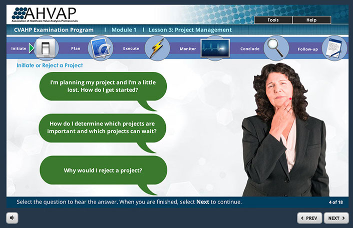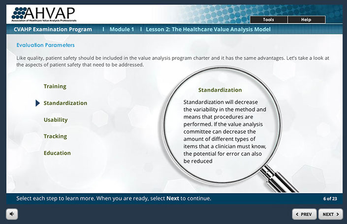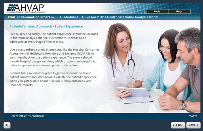 This course was designed to help Healthcare administrators learn to take a Patient-Centered approach to the intricate value analysis process. Helping users to learn important key factors to use to help determine the best outcome for new product request purchases. Responsible for the look and feel of the course and also programming the course in Articulate Storyline.